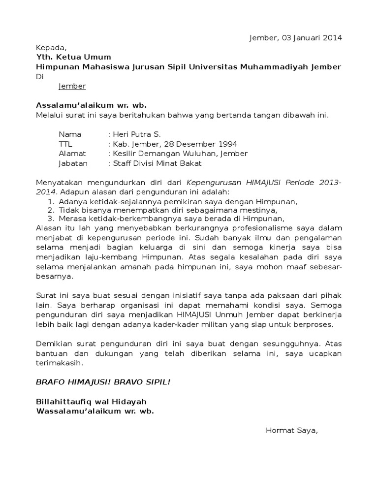 Contoh surat pengunduran diri kerja yang baik dan sopan. Adapun alasan dari pengunduran diri ini adalah Kepada bapak ketua lembaga pendidikan di desa somodaran solo di tempat. Contoh surat pengunduran diri organisasi dari orang tua. Dan agar lebih menunjukkan sisi.